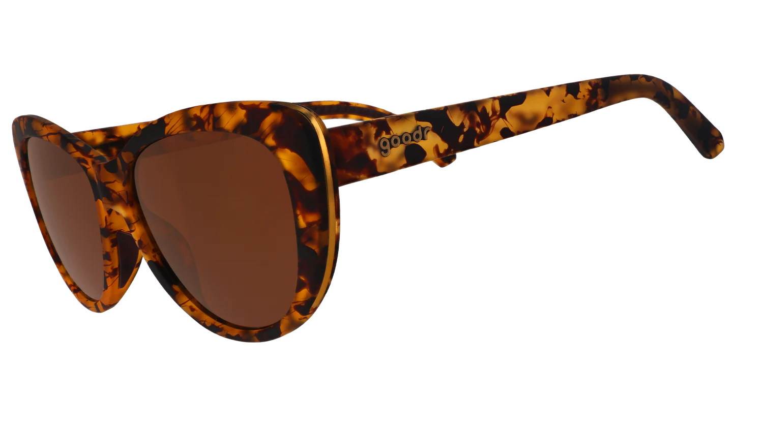 ME-OW !!! Faites un tour du côté sauvage avec ces lunettes de soleil en écaille de tortue marron férocement à la mode, avec des verres non réfléchissants marron et des accents dorés. AVERTISSEMENT : Le port de ces lunettes peut entraîner une recrudescence des bagarres runway en raison d'une envie de style extrême.